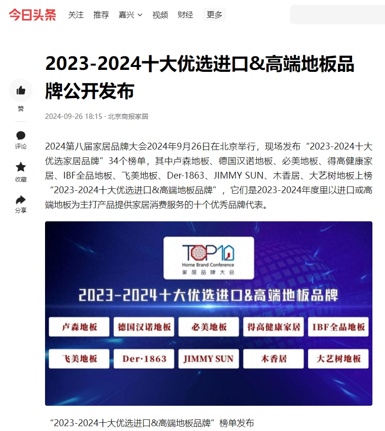 ※ 《2023-2024十大优选进口&高端地板品牌公开发布》(今日头条 北京商报家居 2024-09-26 18:15)
